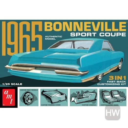 LOADED WITH OPTIONS: The 1965 Bonneville is a classic smooth-lined super cruiser. Fully paintable, it features ALL-NEW, authentically detailed water-slide decals. Build it stock, mild custom or full custom using optional features, including custom mag wheels, pad printed whitewall tires, custom tonneau cover, bucket seats, fully customized front and rear ends, stylized headlights, custom exhaust ports, and more. Wrapped up nicely in vintage-styled packaging!