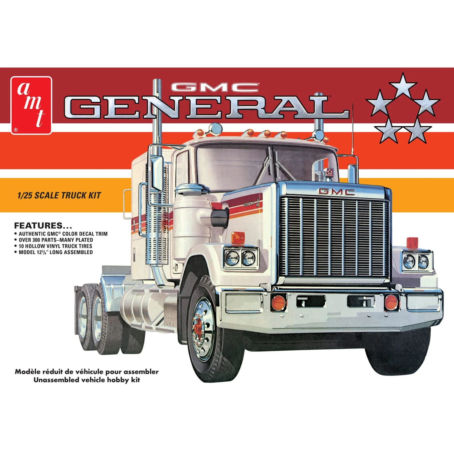 At 12.75 inches long, the GMC General emphasizes size with authentic features, including 60+ chrome parts, 34-inch sleeper, Detroit Diesel 8V92T engine, tilting hood, dual chrome exhaust stacks, super-detailed interior with high back seats, 10 black vinyl tires and more! Fully paintable, with authentic water-slide decals and vintage-style packaging.